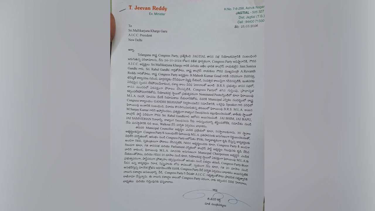 కాంగ్రెస్ కు జీవన్ రెడ్డి రాజీనామా..లేఖ విడుదల