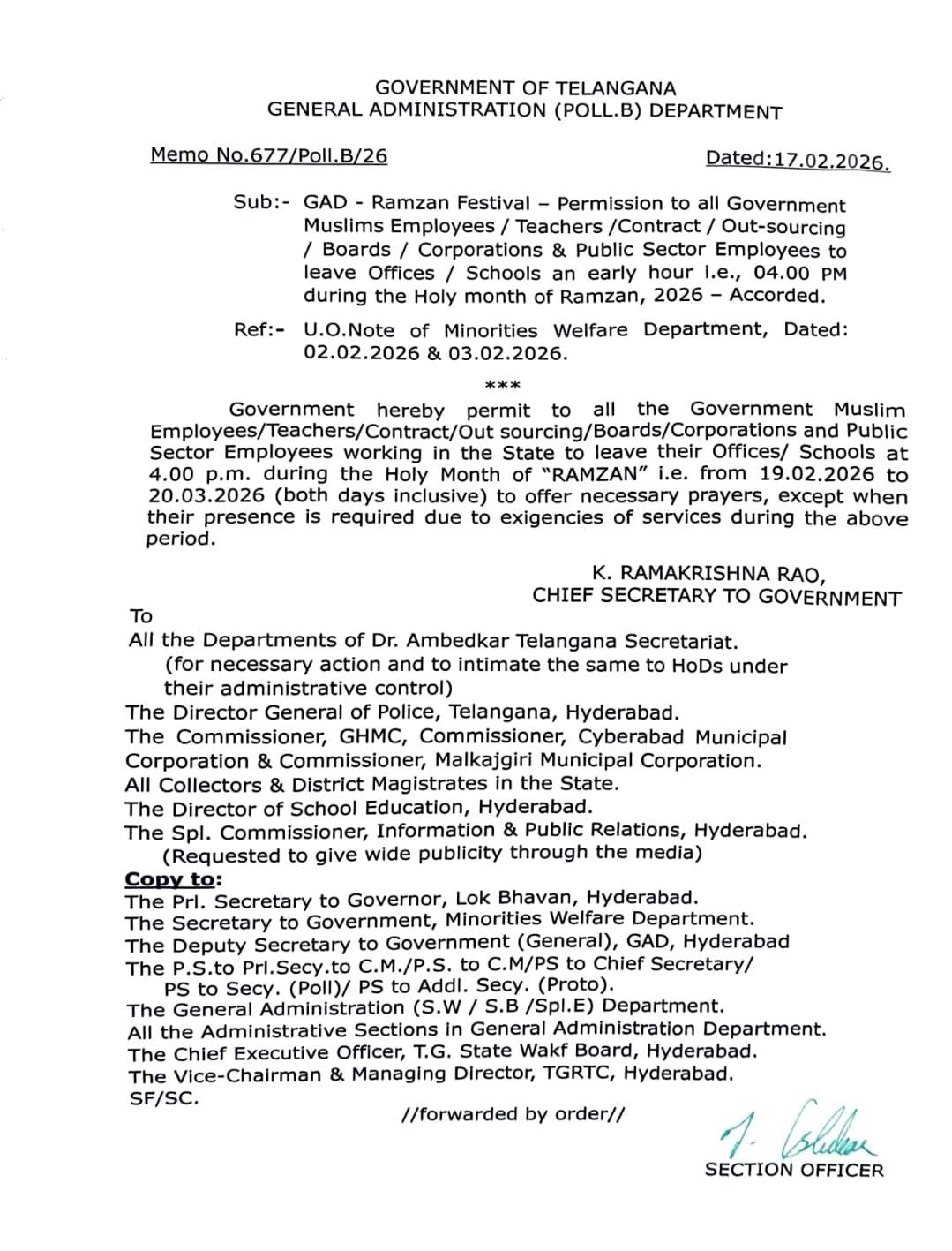 విధాత, హైదరాబాద్ : రంజాన్ మాంసం వేళ ముస్లిం మైనార్టీ ఉద్యోగులకు తెలంగాణ ప్రభుత్వం గుడ్ న్యూస్ తెలిపింది. రంజాన్ నెలలో సాయంత్రం 4 గంటలకే ఆఫీసుల నుంచి వెళ్లేందుకు అనుమతినిస్తూ ఉత్తర్వులు జారీ చేస్తుంది. 2026 ఫిబ్రవరి 19 నుంచి మార్చి 20 వరకు ముస్లిం ఉద్యోగులకు ఈ ప్రత్యేక సడలింపు అమలులో ఉండనుంది. ఈ మేరకు ప్రభుత్వ ప్రధాన కార్యదర్శి రామకృష్ణ రావు ఉత్తర్వులు జారీ చేశారు.