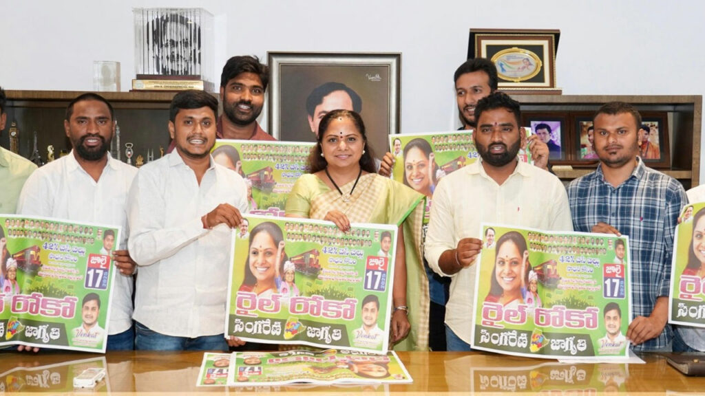 అలాగే బీసీ రిజర్వేషన్ బిల్లులను ఆమోదించాలని కేంద్రం పై ఒత్తిడి తెచ్చేందుకు తెలంగాణ జాగృతి, యునైటెడ్ ఫూలే ఫ్రంట్ ఆధ్వర్యంలో జూలై 17న రైల్ రోకోకు పిలుపునిచ్చామని..ఎన్ని అడ్డంకులు సృష్టించినా రైల్ రోకో చేసి తీరుతామని కవిత ప్రకటించారు. బీసీ రిజర్వేషన్లు తేల్చకుండానే స్థానిక సంస్థలకు ఎన్నికలు నిర్వహించే కుట్రలు చేస్తున్నారన్నారు. రాజకీయ పార్టీల పరంగా అవకాశం కల్పించడం కాదు.. బీసీలకు చట్టబద్దమైన రిజర్వేషన్లు కల్పించాల్సిందేనన్నారు. బీసీ బిల్లులకు చట్టబద్ధత కల్పించేందుకు రాష్ట్ర ప్రభుత్వం ఎలాంటి ప్రయత్నం చేయడం లేదని.. ఢిల్లీకి అఖిలపక్షాన్ని తీసుకెళ్లి కేంద్రంపై ఒత్తిడి పెంచే ప్రయత్నం కూడా చేయలేదని విమర్శించారు. తెలంగాణ జాగృతి, యూపీఎఫ్, బీసీ సమాజం పోరాటాలతోనే రాష్ట్ర ప్రభుత్వం దిగివచ్చి బీసీ బిల్లులను ఆమోదించిందన్నారు. బిల్లుల ఆమోదం కోసం చేపట్టనున్న రైలు రోకోకు సింగరేణి జాగృతి సంపూర్ణ మద్దతు ప్రకటించిందని తెలిపారు. బీసీ రిజర్వేషన్ల కల్పన, రైల్ రోకో అంశాలను విస్తృతంగా ప్రజల్లోకి తీసుకెళ్తాలన్నారు.