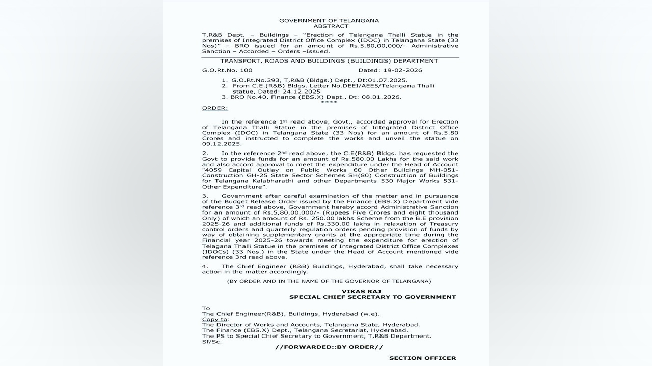 విధాత, హైదరాబాద్ : తెలంగాణ రాష్ట్ర ప్రభుత్వం రాష్ట్రంలోని 33 జిల్లాల్లో తెలంగాణ తల్లి విగ్రహాల ఏర్పాటుకు రూ.5.80 కోట్ల నిధులను మంజూరు చేసింది. ఈ మేరకు తెలంగాణ ప్రభుత్వం ఉత్తర్వులు జారీ చేసింది.