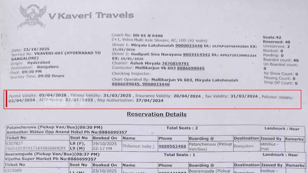 ఇక ఈ బస్సు ప్రమాదానికి గురైన సమయంలో మిర్యాల లక్ష్మయ్య, గుడిపాటి శివనారాయణ డ్రైవర్లుగా ఉన్నారు. లక్ష్మయ్య డ్రైవింగ్ లైసెన్స్ వ్యాలిడిటీ వచ్చే ఏడాది జనవరి 21వ తేదీతో ముగియనుంది. శివ నారాయణ డ్రైవింగ్ లైసెన్స్ కూడా వచ్చే ఏడాది జనవరి 15వ తేదీన ముగియనుంది.