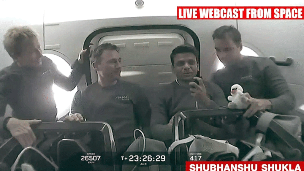 shubhanshu shukla | అంతర్జాతీయ అంతరిక్ష కేంద్రానికి వెళ్తున్న ఆక్సియమ్4 మిషన్ ద్వారా నింగికెగిసిన కొన్ని గంటల తర్వాత కక్ష్యలో తిరుగుతూ, శుభాంశు భూమికి తన మొదటి సందేశాన్ని వినిపించాడు. 44ఏళ్ల సుదీర్ఘ విరామం తర్వాత శూన్యాకాశంలోకి అడుగుపెట్టిన తొలి వ్యోమగామి శుభాంశు శుక్లా. “ అందరికీ అంతరిక్షం నుండి నమస్కారం. నాతోటి వ్యోమగాములతో కలిసి ఇక్కడ ఇలా ఉండటం చాలా ఉద్వేగానికి గురిచేస్తోంది. ఇది గొప్ప ప్రయాణం. రాకెట్లోని క్యాప్సూల్లో కూర్చున్నప్పుడు నా మదిలో ఒకటే బలమైన ఆలోచన.. మనం వెళ్లాల్సిందే.” అని శుక్లా ఉత్సాహంగా తెలిపారు. ప్రయాణం మొదలైనప్పుడు ఒక్కసారిగా సీటు వెనక్కి బలంగా అతుక్కుపోయినట్లైంది. కాసేపటికి ఏం లేదు. అంతా నిశ్శబ్దం. నేను గాల్లో తేలుతున్నానని శుభాంశు తన తొలి అంతరిక్ష ప్రయాణ అనుభవాన్ని వివరించారు. స్పేస్ ఎక్స్ – ఫాల్కన్ 9 రాకెట్కు అనుసంధానించబడిన డ్రాగన్ వ్యోమనౌకలో ఉన్న ఈ బృందం, నిన్న కెన్నడీ అంతరిక్ష కేంద్రం నుండి ఆకాశానికెగిరింది.