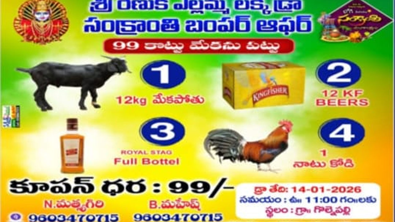 సంక్రాంతి పండుగ వేళ నాన్వెజ్ ప్రియులకు నోరూరించేలా 99 రూపాయలకే మేకపోతును ఎగరేసుకుపోయే చాన్స్ కల్పించారు లక్కీ డ్రా నిర్వాహకులు. శ్రీ రేణుక ఎల్లమ్మ లక్కీ డ్రా పేరిట మొదటి బహుమతిగా మేకపోతును ఇవ్వనున్నారు. రెండు, మూడో బహుమతులు మందుప్రియులకు కిక్కెక్కించేవి. అవేంటంటే.. రెండో బహుమతి కింద 12 కింగ్ ఫిషర్ బీర్ల కార్టన్, మూడో బహుమతి రాయల్ స్టాగ్ ఫుల్ బాటిల్ ఇవ్వనున్నారు. ఇక నాలుగో బహుమతిగా మాంఛి నాటుకోడిని ఇవ్వనున్నారు. జనవరి 14, 2026న సంక్రాంతి పండుగ సందర్భంగా లక్కీ డ్రా నిర్వహించనున్నారు. ఈ లక్కీ డ్రాలో గెలుపొందినవారికి పైన పేర్కొన్న బహుమతులు అందించనున్నారు.