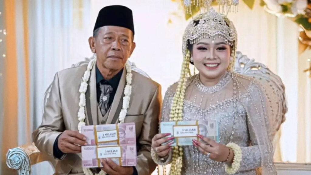తూర్పు జావాలోని పాసిటాన్ రీజెన్సీలో అక్టోబర్ 1న తర్మన్ (74) అనే వృద్ధుడు, షెలా అరికా (24) అనే యువతిని అంగరంగ వైభవంగా పెళ్లి చేసుకున్నాడు. ఈ సందర్భంగా వరుడు, వధువుకు మూడు బిలియన్ ఇండోనేషియా రూపాయలు అందించినట్లు బహిరంగంగా ప్రకటించాడు. మొదట్లో వధువుకు ఒక బిలియన్ రూపాయలు (సుమారు రూ.50 లక్షలు) చెల్లిస్తానని చెప్పారు. కానీ, పెళ్లి వేడుకలో దాన్ని హఠాత్తుగా మూడు బిలియన్లకు పెంచాడు. వరుడు మూడు బిలియన్ల రూపాయల చెక్కును అందించగానే అతిథులు ఉప్పొంగిపోయి చప్పట్లు కొట్టారు. ఈ పెళ్లిలో అతిథుల నుంచి బహుమతులు స్వీకరించే బదులు, నిర్వాహకులు ప్రతి ఒక్కరికీ నగదును పంపిణీ చేశారు.