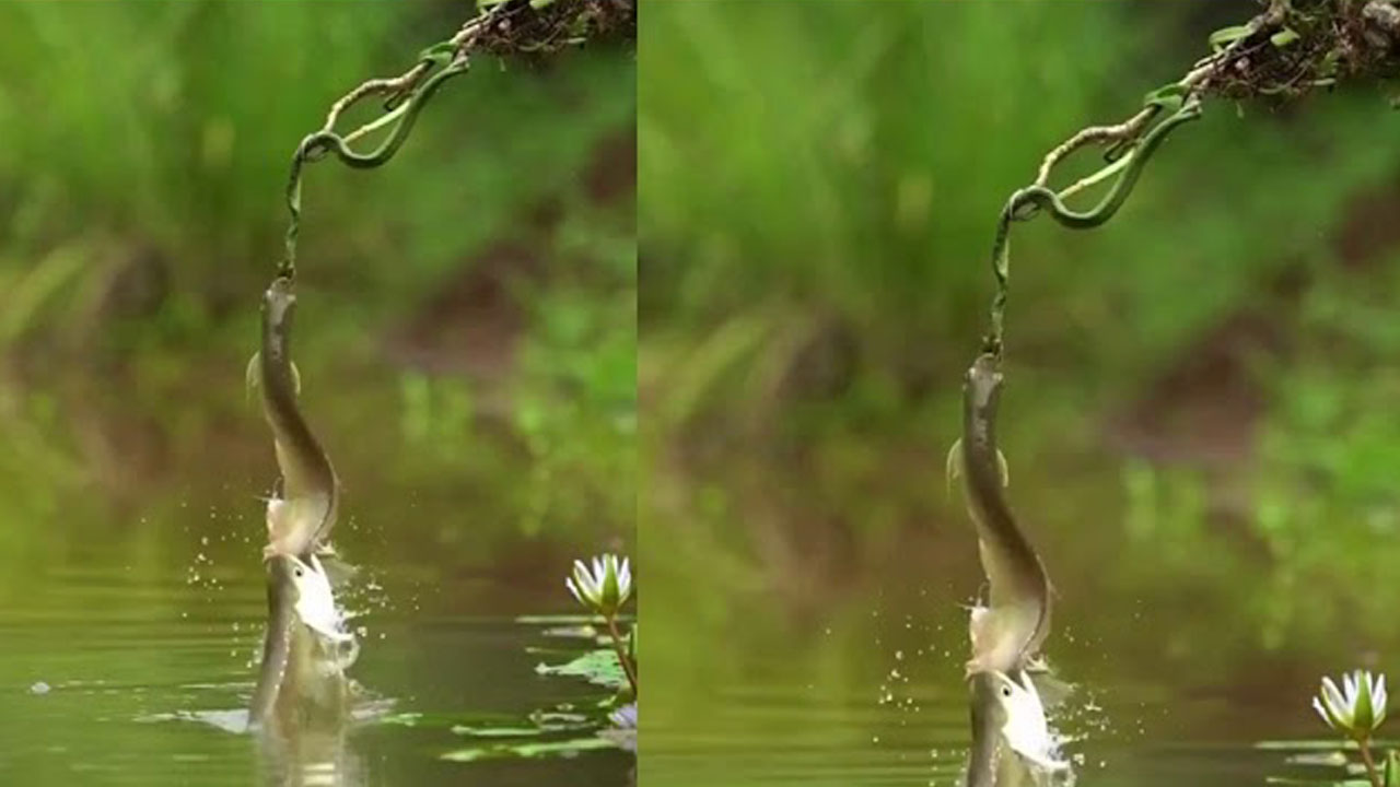 వివరాల్లోకి వెళితే నీటిలో ఉన్న సాధారణ చేప ఒడ్డున ఉన్న చెట్టు కొమ్మను చుట్టుకున్న పసిరిక పామును చూసింది. పామును తినాలనుకున్న చేప ఎగిరి దాని తలను నోట బిగించింది. అయితే నీటిలో నుంచి ఎగిరిన చేప తిరిగి నీటిలోకి పడిపోకుండా ఆ పాము మెలికలుగా కొమ్మను చుట్టుకున్న తీరు అడ్డుకుంది. ఇంకేముంది పాము తలను నోటి నుంచి వదలలేక..నీటిలో పడిపోలేక గాల్లోనే ఆ చేప విలవిలలాడుతూ కొట్టుకోసాగింది. ఇదంతా గమనించన మరో చేప ఆ చేపను రక్షించేందుకు చేసిన ఉపాయం విస్మయపరిచింది.