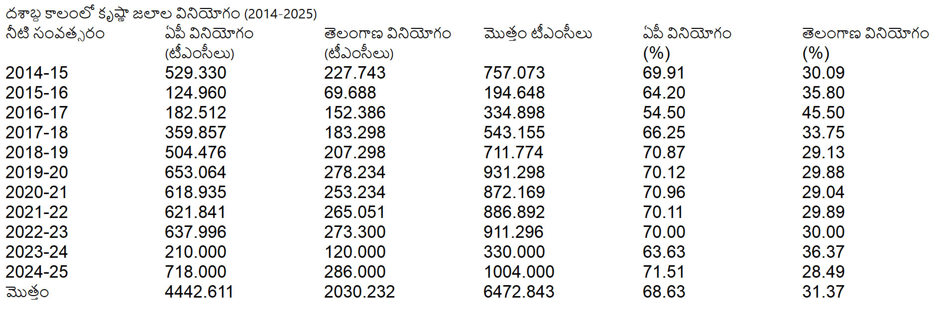 2014-15 నీటి సంవత్సరం నుంచి 2024-25 నీటి సంవత్సరం వరకు ఏ ఒక్క ఏడాది కూడా తమకు కేటాయించిన జలాల్లో కనీసం 90 శాతం కూడా తెలంగాణ వినియోగించుకోలేదు. 2016-17 నీటి సంవత్సరంలో మాత్రమే 45.50 శాతం నీటిని వినియోగించుకున్నారు. ఇంకో విచిత్రమైన విషయం ఏమంటే.. ఏపీ పాలకులు ఏ ఒక్క నీటి సంవత్సరంలో కూడా 54.5 శాతానికి తక్కువ కాకుండా జలాలను సద్వినియోగం చేసుకుని ముందు వరుసలో ఉన్నారు. తద్వారా పచ్చటి పైర్లతో రైతులకు చేతినిండా పని కల్పిస్తున్నారు.