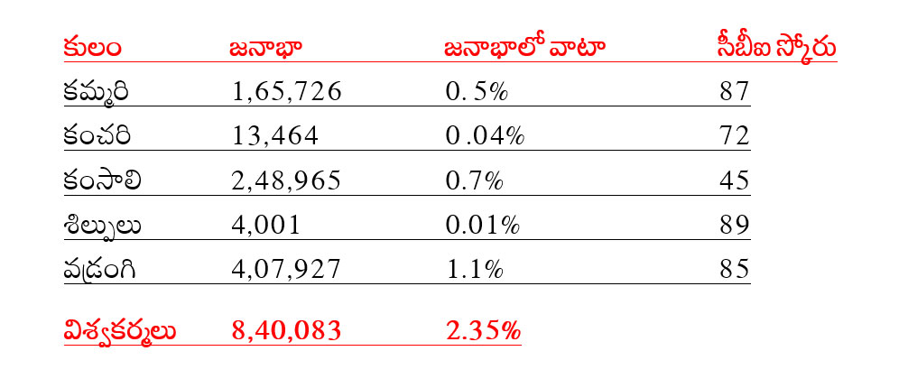 ఈ ఐదు వృత్తులను కలిపి లెక్కిస్తే జనభా ప్రకారం 8,40,083 మంది ఉన్నట్లు తేలుతోంది. మొత్తం జనాభాలో 2.35 శాతానికి చేరుకుని ఒక బలమైన శక్తిగా కనిపిస్తోంది. ముఖ్యంగా రాజకీయ నాయకత్వం, పార్టీలు సహజంగానే అనుసరించే కులబలాల ప్రకారం నిర్ణయాత్మకమైన కులంగా భావించే అవకాశం ఉంటోంది. దీని వల్ల అనేక ప్రయోజనాలు ఈ కులానికి లభిస్తాయనడంలో సందేహంలేదు. లేకుంటే ఈ వేర్వేరు లెక్కలతో రాజకీయ పక్షాలు లెక్కచేయని పరిస్థితి ఉండే ప్రమాదం ఉంది. అందుకే ఇప్పటికైనా సర్వే వేర్వేరుగా నిర్వహించిన ఈ ఐదు వృత్తులు (కులాల)ను కలిపి భవిష్యత్ సంక్షేమ, ఆర్ధిక, రాజకీయ ప్రాధాన్యతలు కల్పించాలని విశ్వకర్మ సంఘాల ప్రతినిధులు కోరుతున్నారు.
